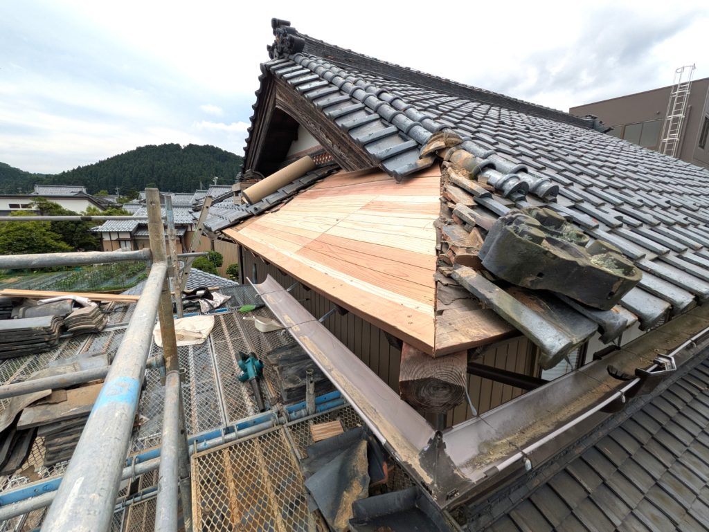軒先が折れたのでこれから瓦を捲り、木下地を捲り、補強しながら直していきます。